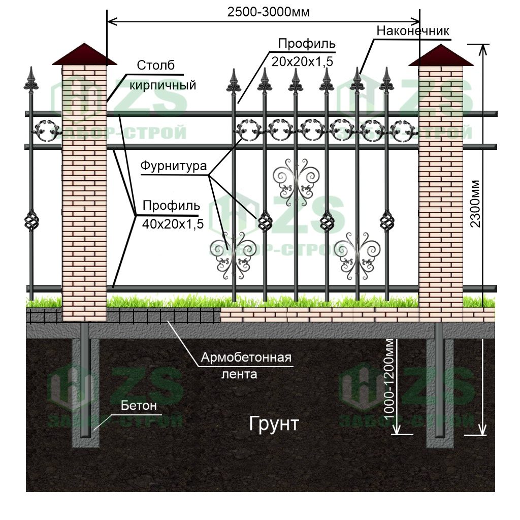 Конструкция кованого забора на ленточном фундаменте с кирпичными столбами: